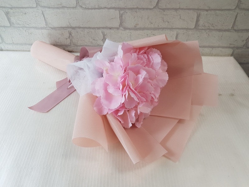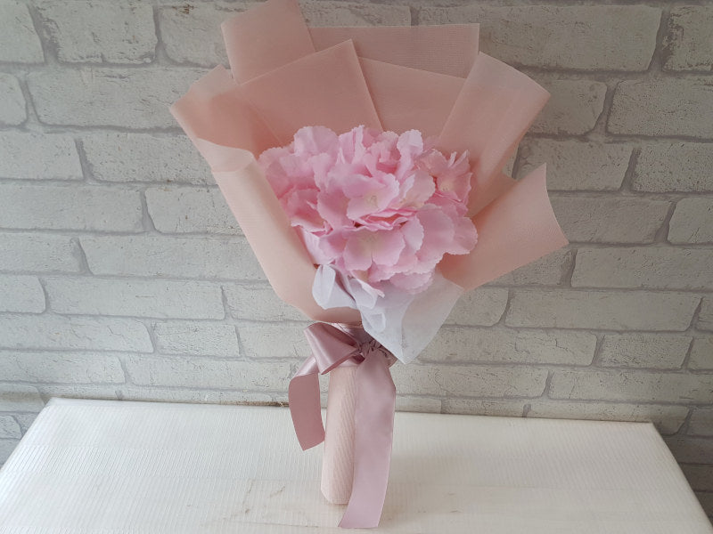 A delicate hydrangea bloom, lovingly wrapped in pastel pink, capturing the beauty of everlasting affection that never fades