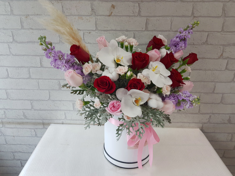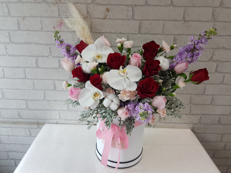 [Medium] Mixture of 20 Roses, 10 Carnation Spray, 5 Matthiolas, Phalaenopsis Orchids, and Silver Leaves