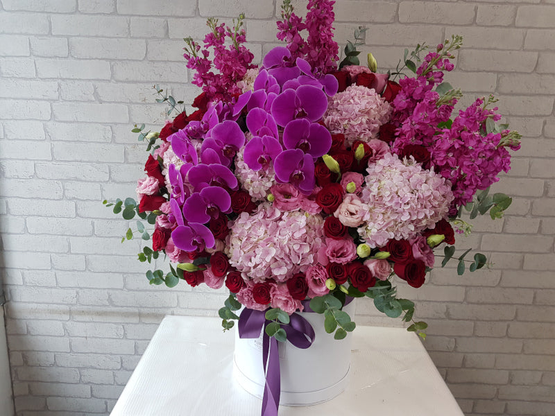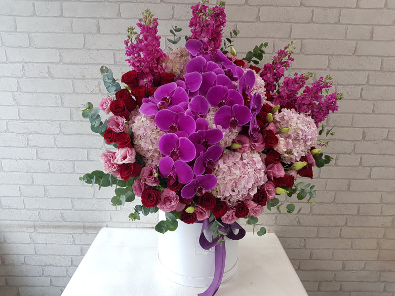 A flurry of red and purple blossoms in this voluminous arrangement that exudes sophistication.
