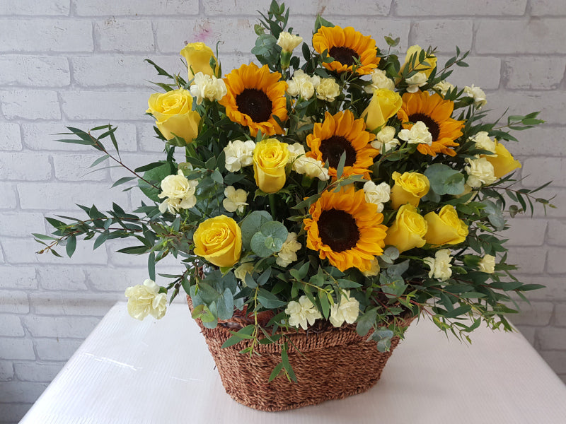 [As Shown] Mixture of 5 Sunflower, 10 Roses, Carnation Spray, Eucalyptus and Parvifolia Leaves [Large] Mixture of 7 Sunflower, 15 Roses, Carnation Spray, Eucalyptus and Parvifolia Leaves