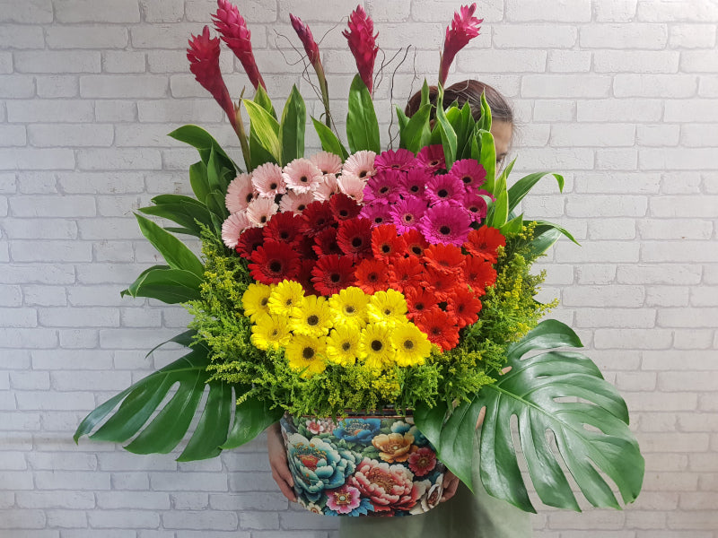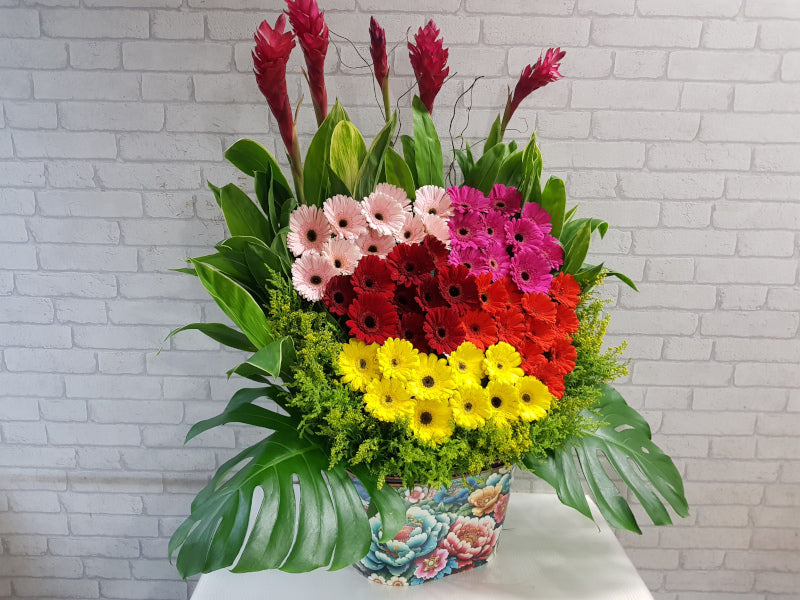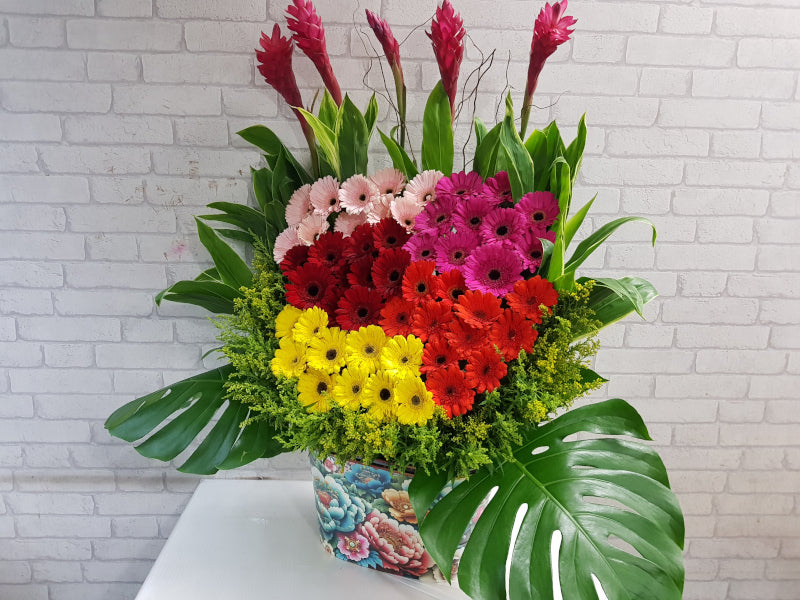 A vivacious display composed of colourful Gerberas and bright Ginger flowers, embellished with lush foliage, makes a stunning floral display.