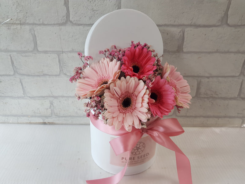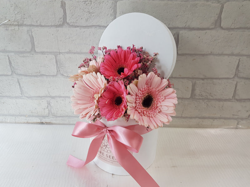 Sweet Gerberas peeking out from their box, along with their companion Caspia flowers, ready to greet their recipient.
