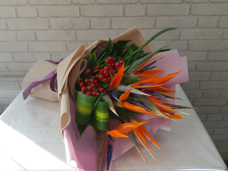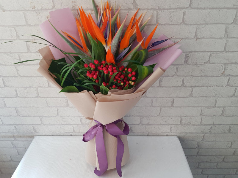 The vibrance of the tropics is encapsulated in this Bird of Paradise bouquet, lush with flower, berries, and foliage, its energy ready to match that of the recipient's.
