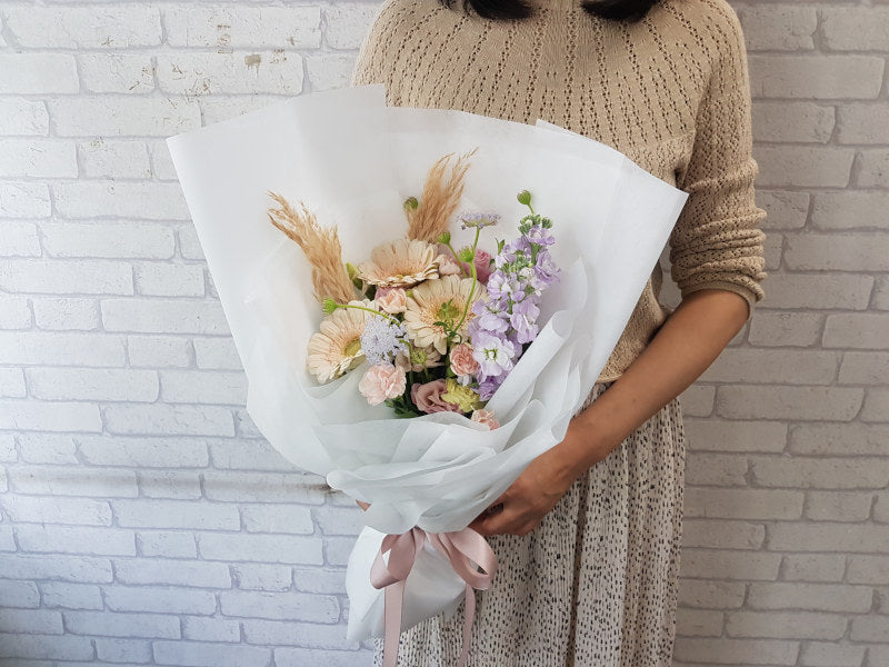 [As Shown] Mixture of Gerberas, Eustomas, Carnations, Carnation Spray, Lace Flower and Silver dollar leaves