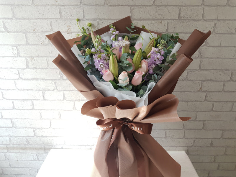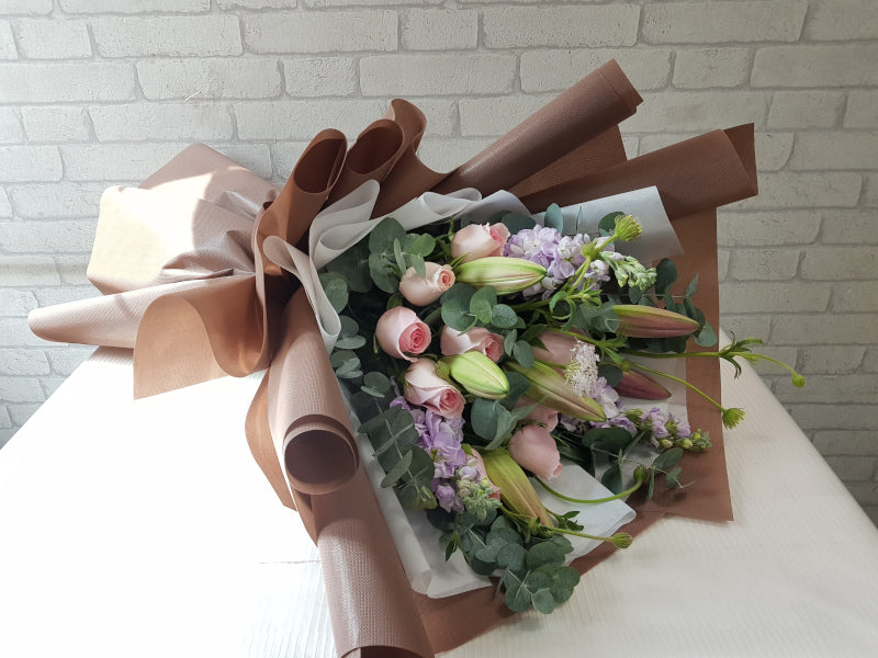 A delightful combination of Lilies, Roses, and Matthiola arranged in a brown wrapper, perfect for a rustic and elegant gift