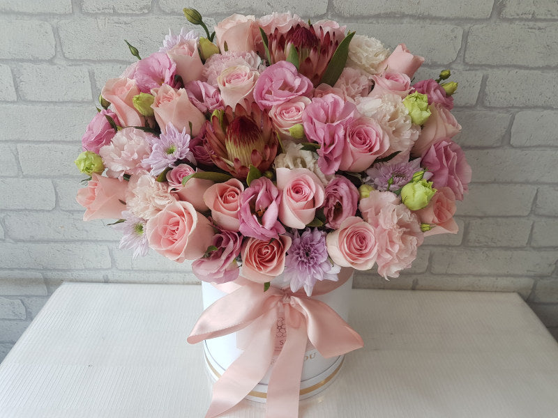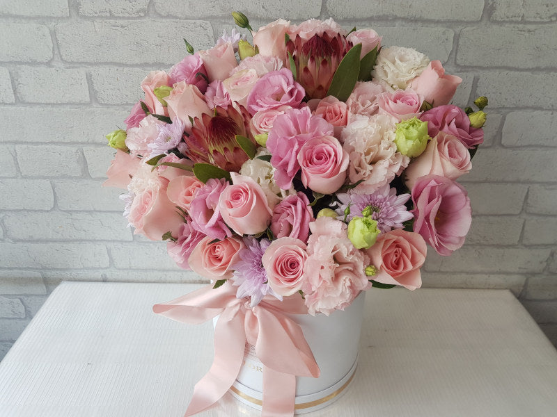 A charming mix of pink Roses, Eustomas, Chrysanthemums, and Protea in a white box, radiating romance and elegance