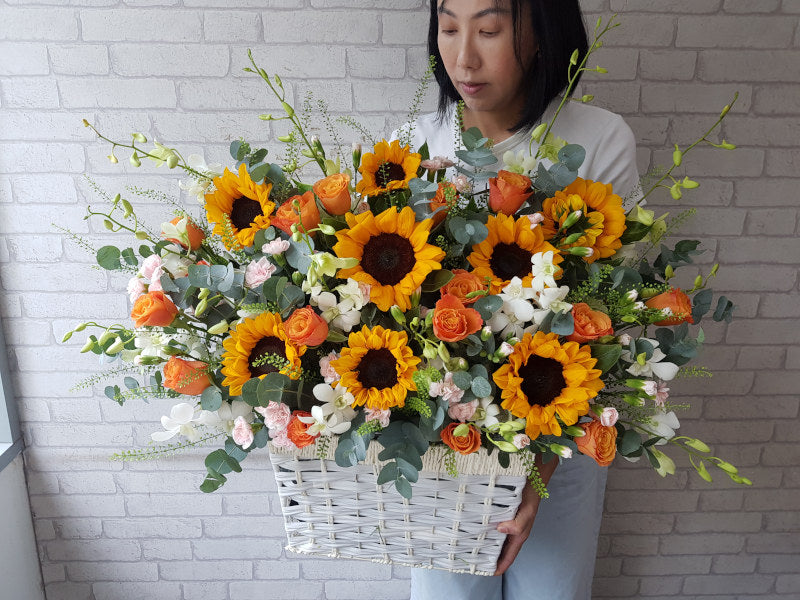 A stunning white basket arrangement with sunny sunflowers, vibrant orange roses, and elegant white orchids. The perfect gift to brighten someone special’s day with warmth, joy, and love