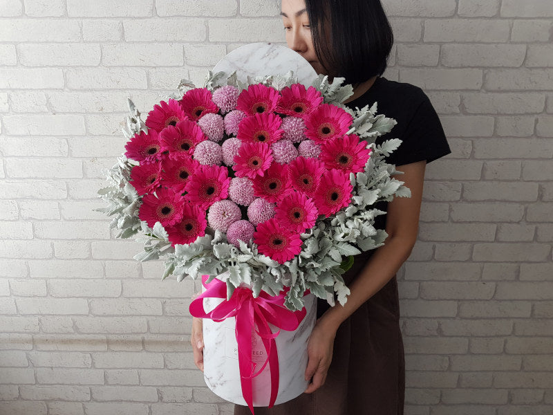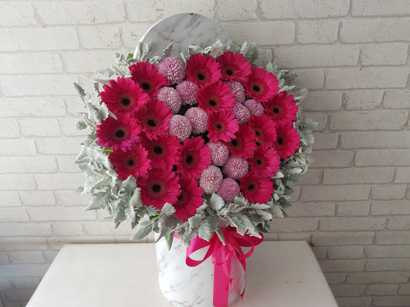 A bold and striking pairing of vivid pink gerberas and purple ping pong blooms, arranged in a tall white box. Eye-catching, lively, and full of colour—perfect for making a standout statement