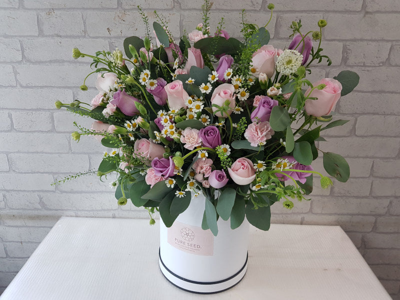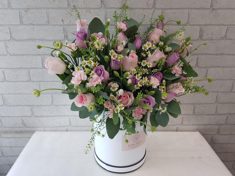 Soft pink and purple roses paired with cute little chamomile blooms, all tucked nicely into a clean white box. Simple, sweet, and effortlessly lovely — just the kind of flowers that make you smile without trying.