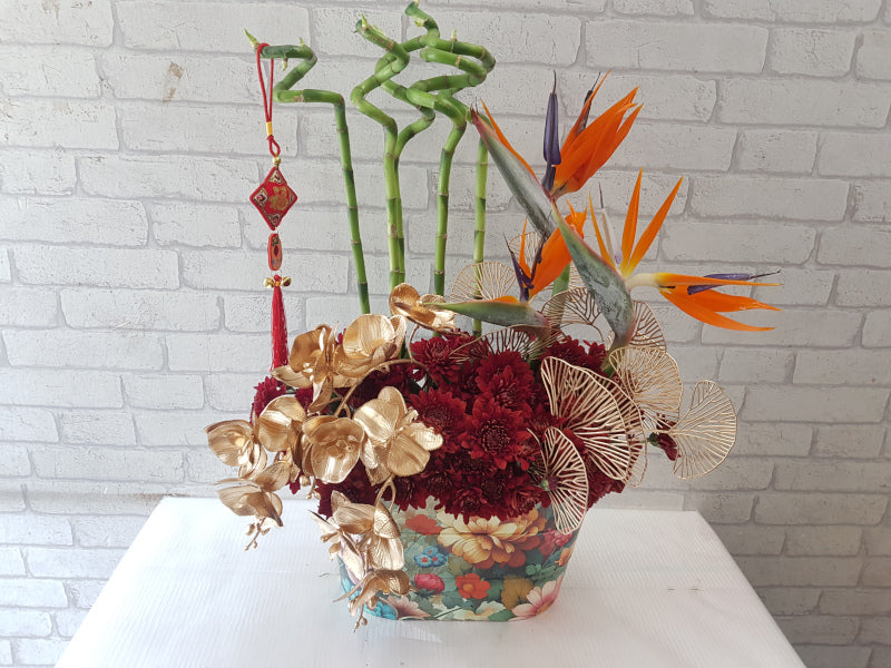 [As Shown] Mixture of Bird of Paradise, Orchids, Chrysanthemum, Lucky Bamboo and CNY decoration