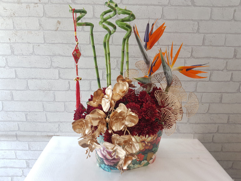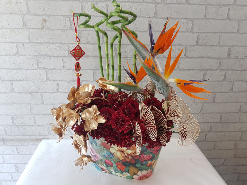 Welcome the Lunar New Year with a vibrant floral combination of Bird of Paradise, Orchids, Chrysanthemum, Lucky Bamboo, symbolising renewal, success, and joyful beginnings