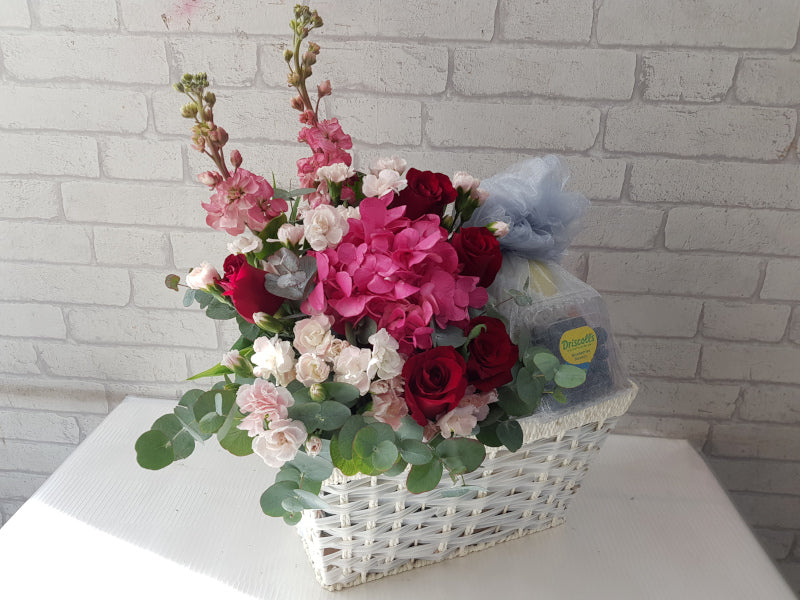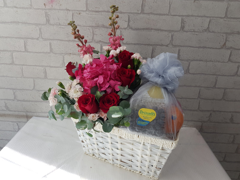 A charming basket brimming with fresh blooms and juicy seasonal fruits, bringing vibrant colors and wholesome goodness — the perfect get well soon gift.