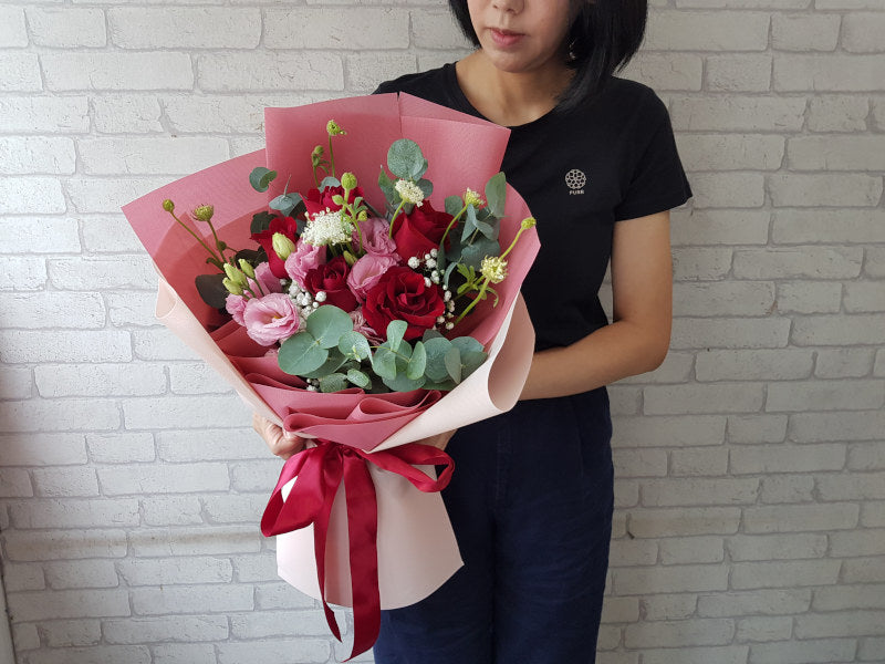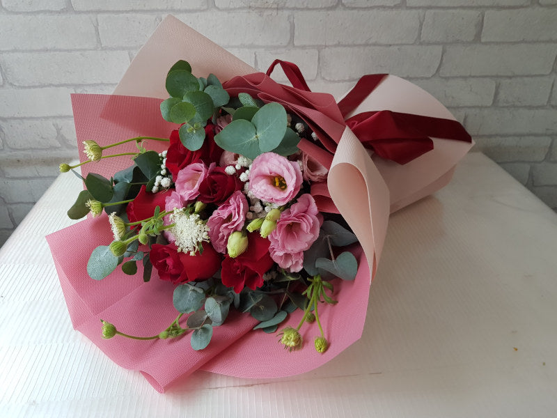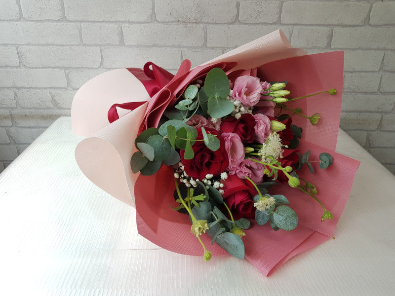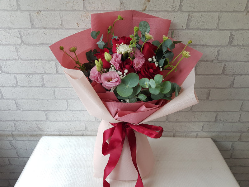 A passionate hand bouquet featuring vibrant red roses and delicate eustomas, beautifully wrapped in a matching red wrapper, perfect for expressing deep love and heartfelt emotions.
