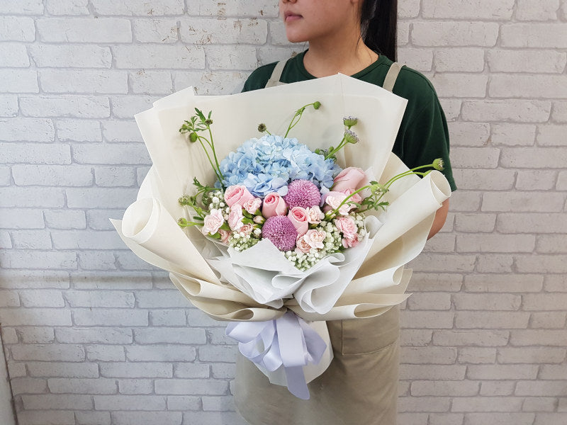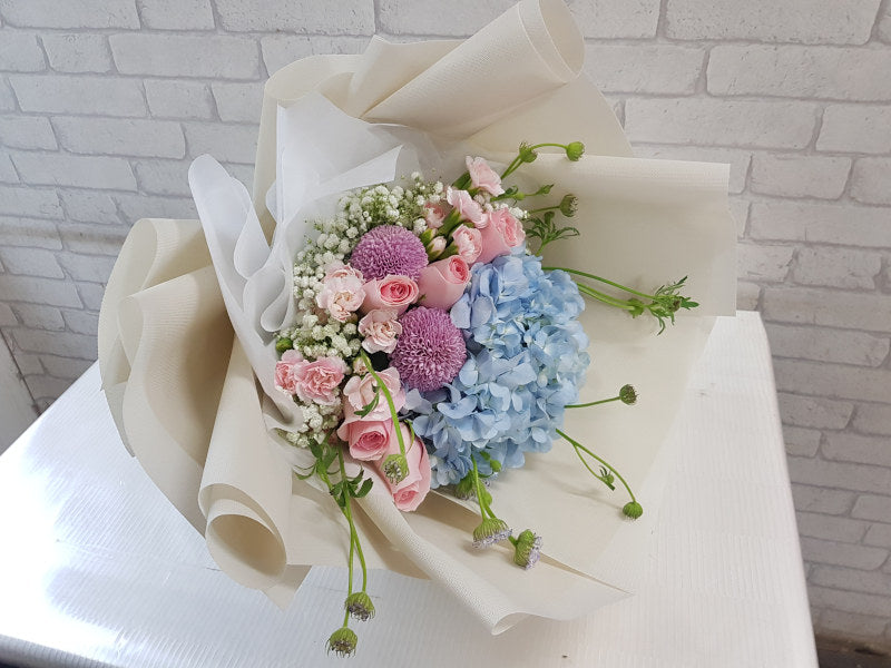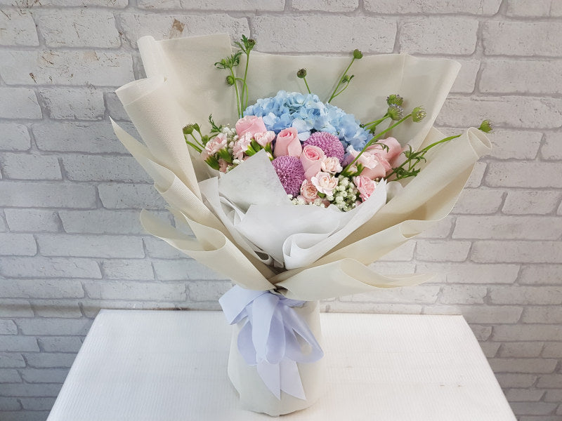 A stylish hand bouquet featuring lush blue hydrangeas paired with soft pink roses and charming carnations. A perfect balance of elegance and sweetness — ready to brighten any moment with love and delight.