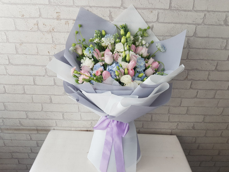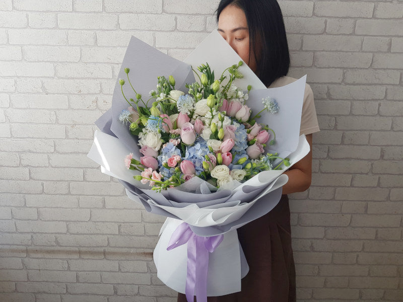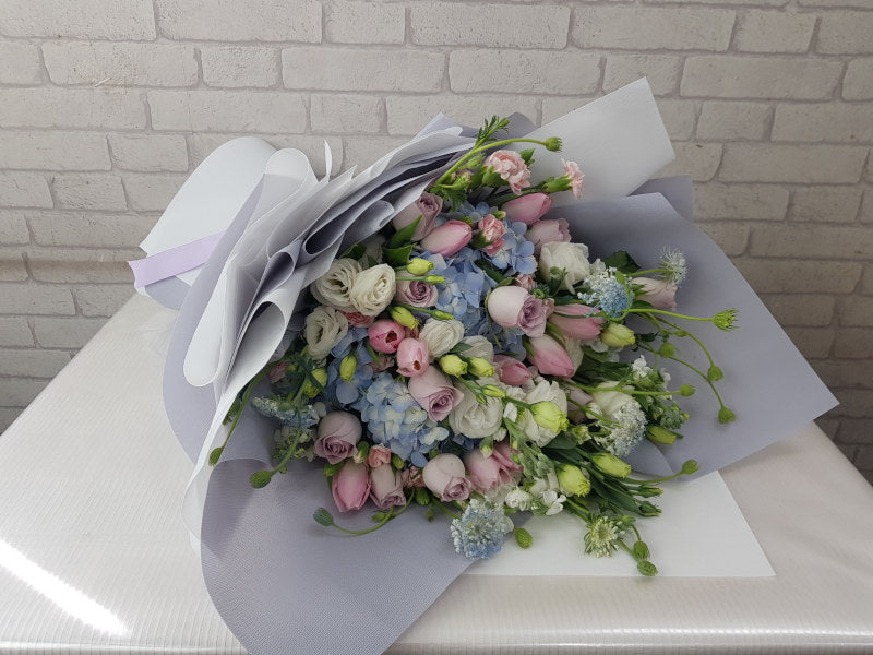 [As Shown] Mixture of 8-10 tulip, 10 Rose, Hydrangea, Eustoma, Carnation spray, Matthiola, Lace flower and Silver Dollar Leaves