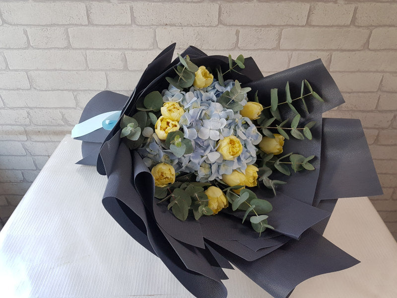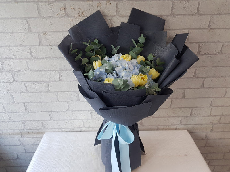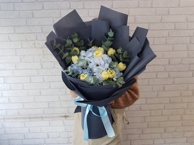 Sunny yellow tulips meet cool blue hydrangeas in this striking hand bouquet, wrapped in sleek black paper for a bold, modern contrast. A perfect mix of cheerfulness and elegance in every stem