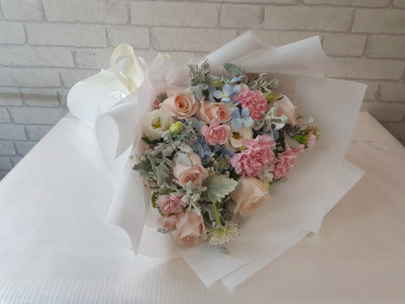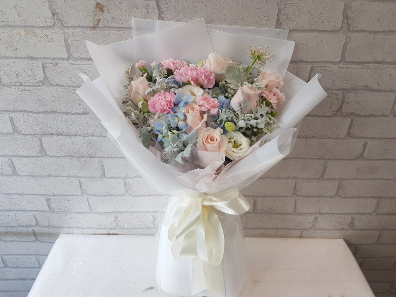 A graceful blend of blue hydrangeas, pink roses, airy lace flowers, eustomas and soft carnation sprays, cool tones meet delicate textures, creating a calm, refined arrangement perfect for any heartfelt moment.