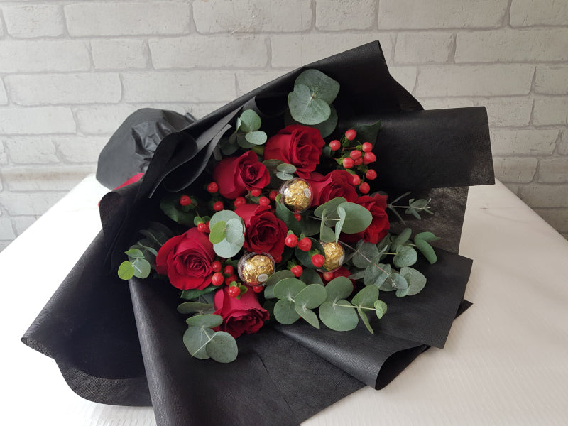 A bouquet featuring velvet red roses and decadent Ferrero Rocher chocolates wrapped in dramatic black paper, Best gift for an unforgettable surprise for the one you love