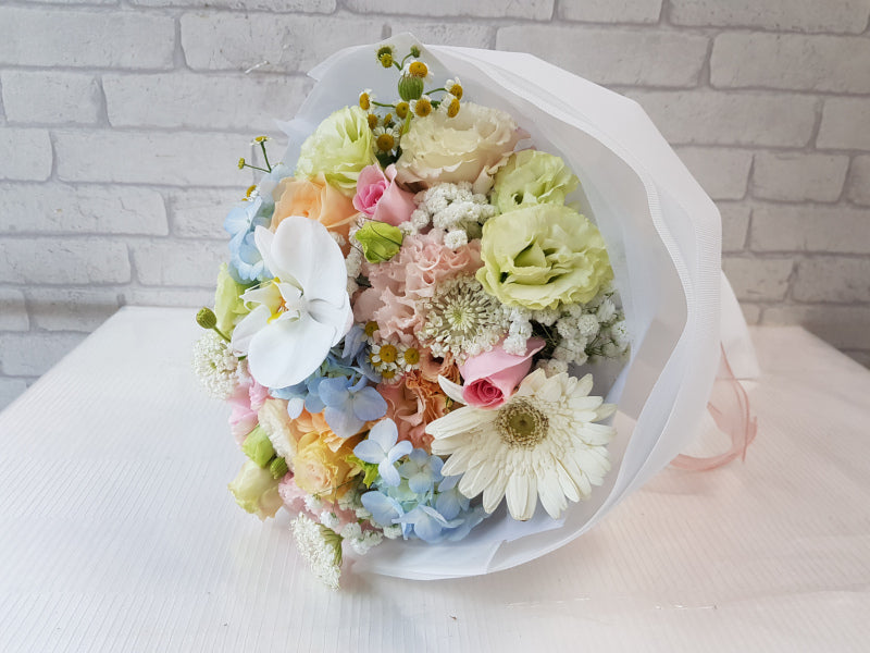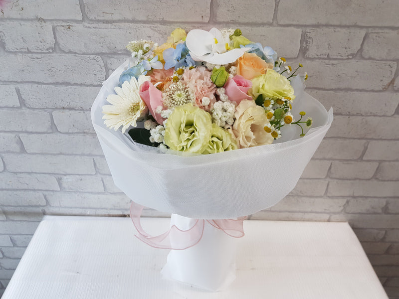 [As Shown] Mixture of Roses, Carnation, Phalaenopsis Orchids, Hydrangeas, Eustomas, Gerbera, Chamomile, Lace flower and Baby Breath