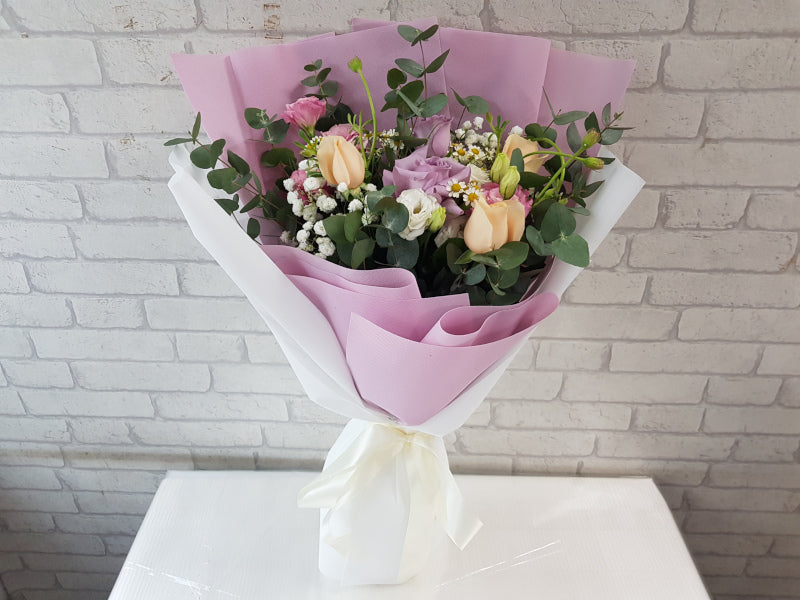A lovely hand bouquet of Roses, Eustomas, Baby breath, Chamomile and Baby Breath in soft pink and purple tones. A perfect for expressing simple love, care, and appreciation.