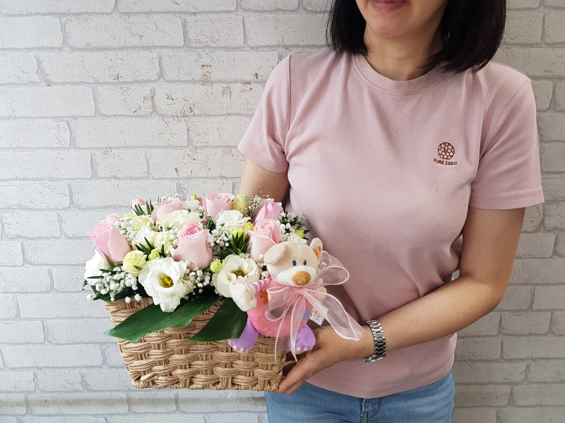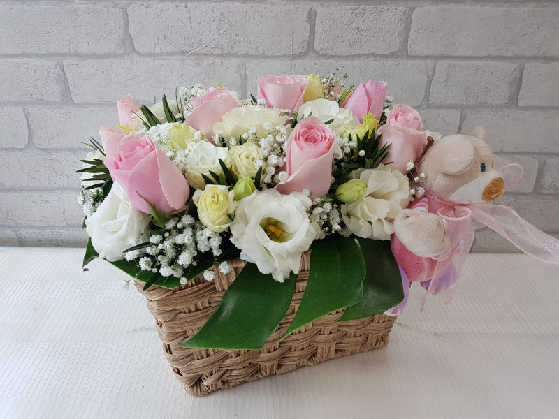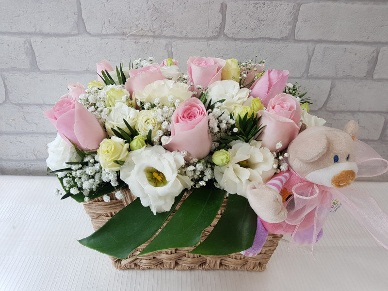 Blushing Roses are sweetened with white Eustomas and generous sprays of Baby's Breaths. A soft toy that will help the baby learn to grasp and play accompanies the floral arrangement.