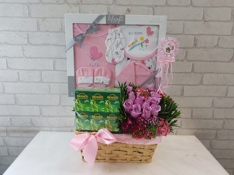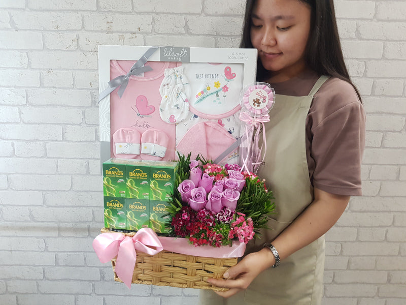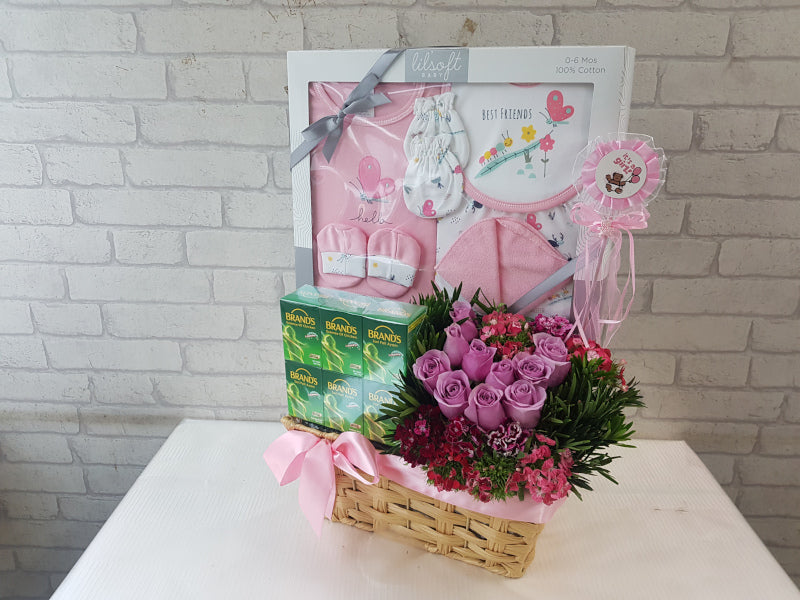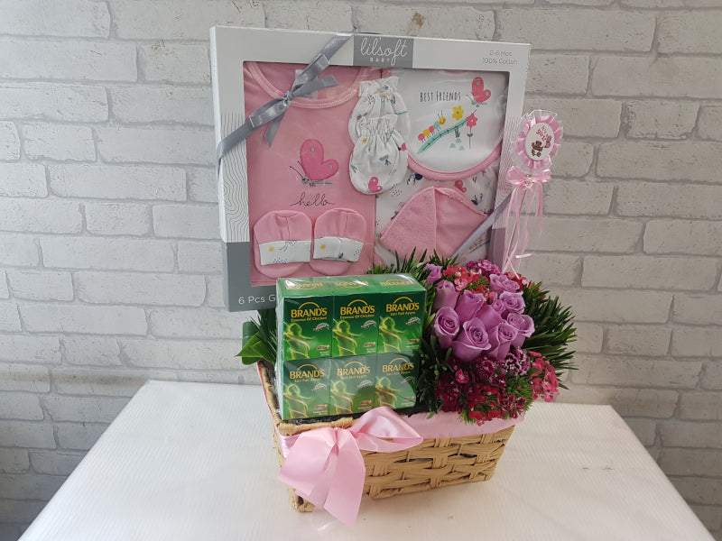 Send this gift of Roses and Sweet Williams to add to the joy of having a baby girl, and nourishing Chicken Essence to rejuvenate the mother (and the father too!); tucked inside the box is also a set of baby clothing to keep the newborn all warm and snuggly.