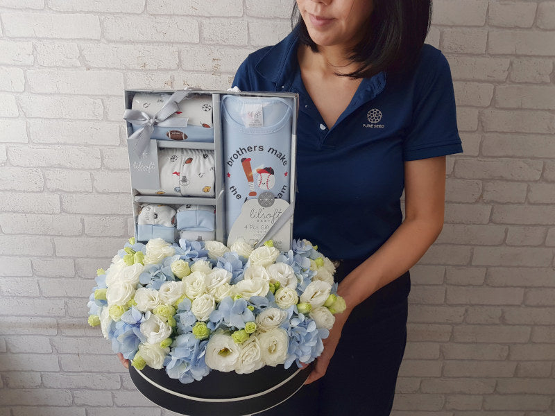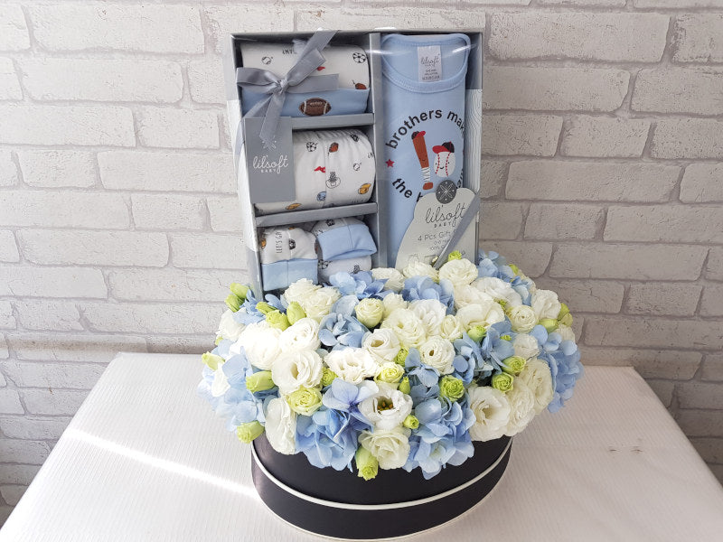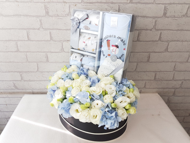 Help the baby start life off in style! This newborn gift comes with a set of rompers, arranged atop a beautiful flurry of Hydrangeas and Eustomas to enhance the already joyous occasion.