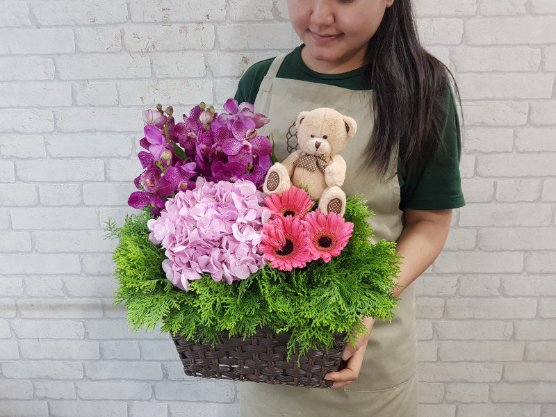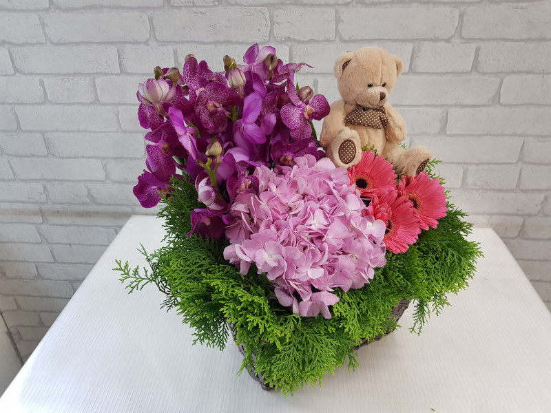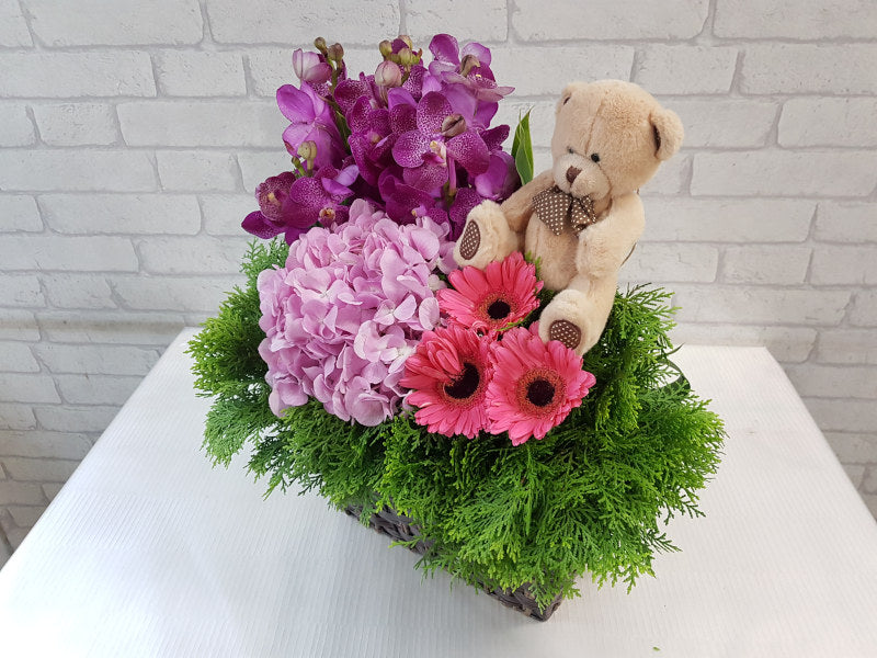 [As Shown] Mixture of Hydrangeas, Orchids, Gerberas and teddy bear soft toy (H)30cm x (W)14cm