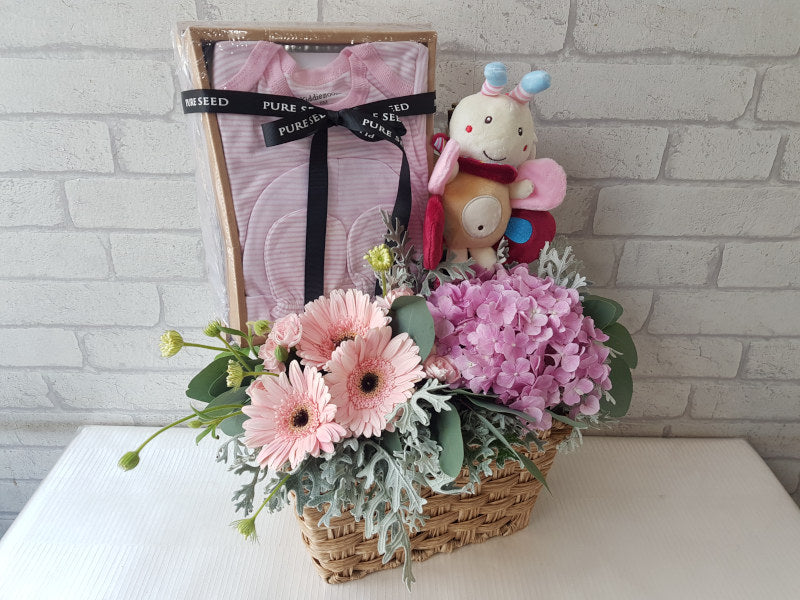 A delightful gift basket celebrating a baby girl, adorned with soft pink flowers, a cuddly musical toy, and a sweet romper set, radiating love, joy, and tender blessings.