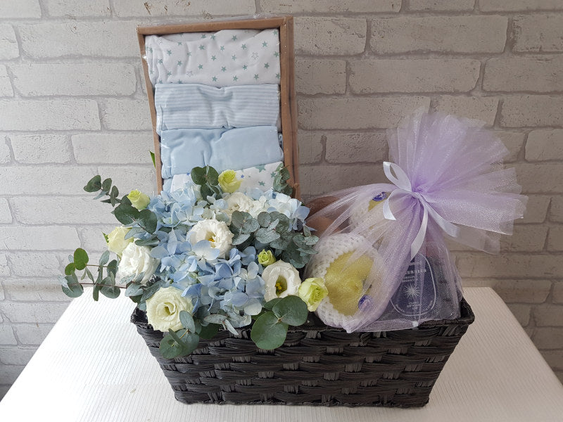 A charming gift basket designed to welcome a baby boy, combining soothing blue flowers, fresh fruits, and a cute romper set, symbolizing joy, care, and blessings