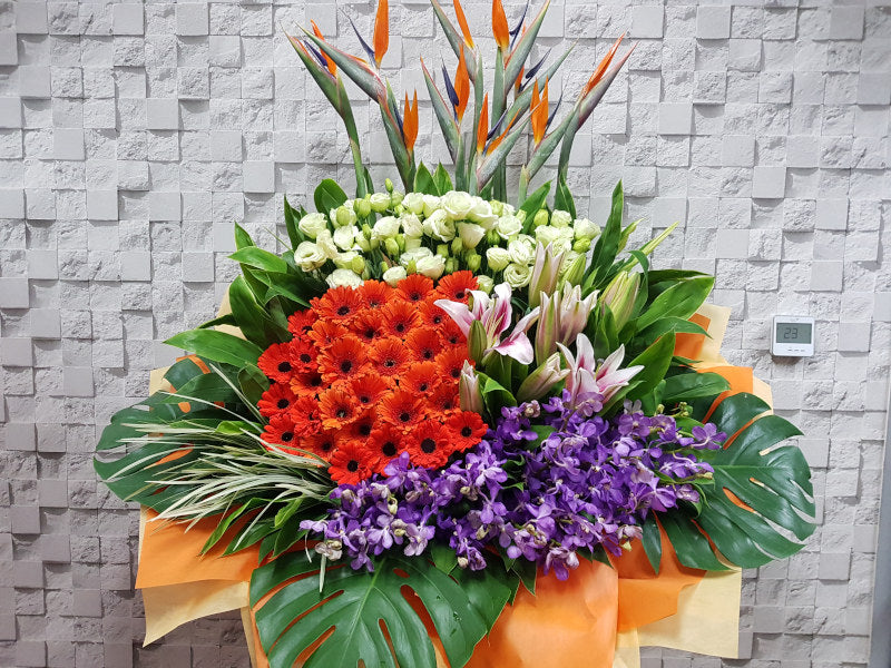 A magnificent Opening Stand that demands attention with its vast spread of blossoms, featuring a centre of Gerberas, Lilies and Eustomas, a fringe of Orchids and leaves, and a crest of Bird of Paradise flowers.