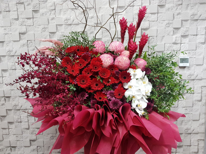 A striking red prosperity flower stand bursting with vibrant blooms, symbolizing success, good fortune, and powerful new beginnings. Perfect for grand openings, this bold arrangement radiates festive energy and delivers your warmest wishes for a thriving business ahead