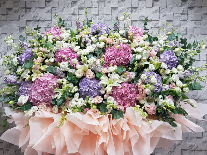 [As shown] Mixture of Hydrangeas, Lilies, Eustomas, Orchids and Eucalyptus Leaves