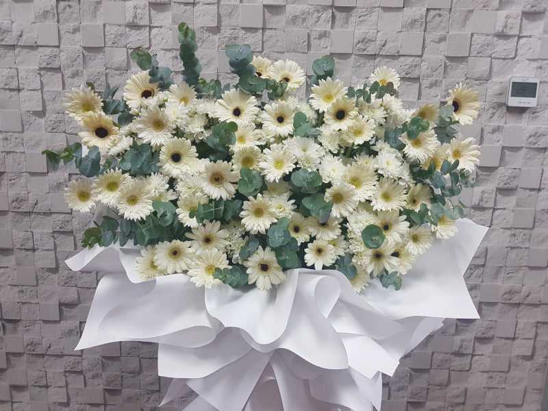 A timeless wooden stand of pure white blossoms, offering a serene and dignified tribute to a life of grace.