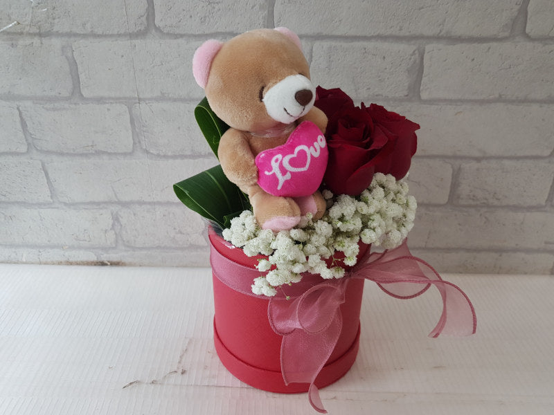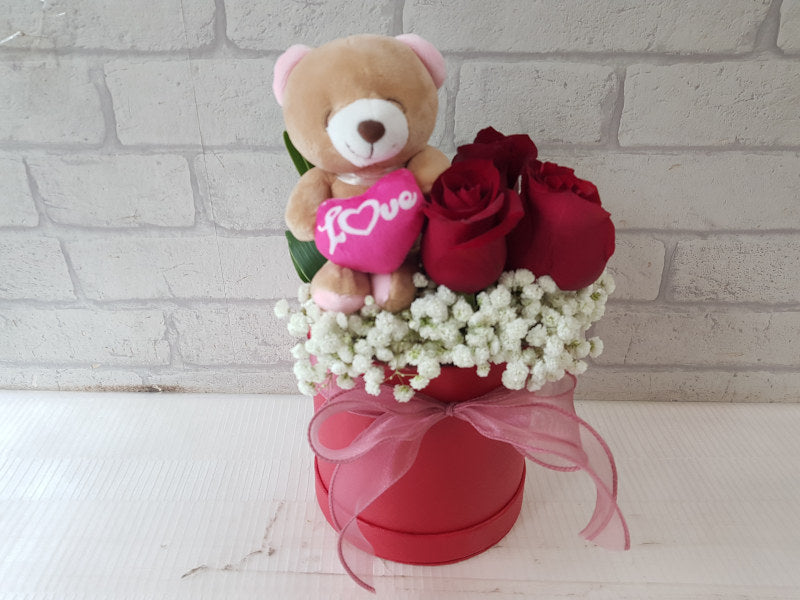 [As Shown] Mixture of 3 Roses, Baby Breath and little bear soft toy. Estimated size of 8cmx13cm