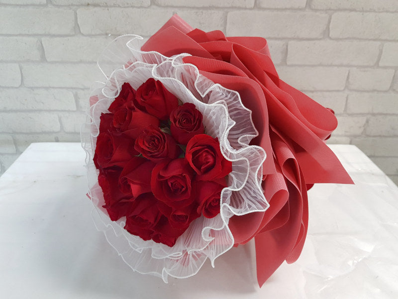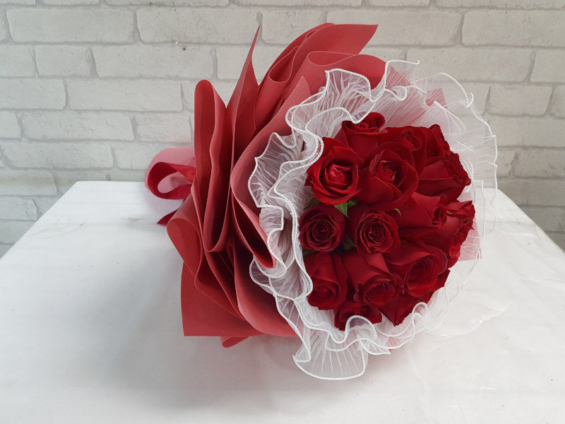 A love bolstered by passion and romance embodied in a hand bouquet with gorgeous Roses wrapped in layers of white frills and red paper.