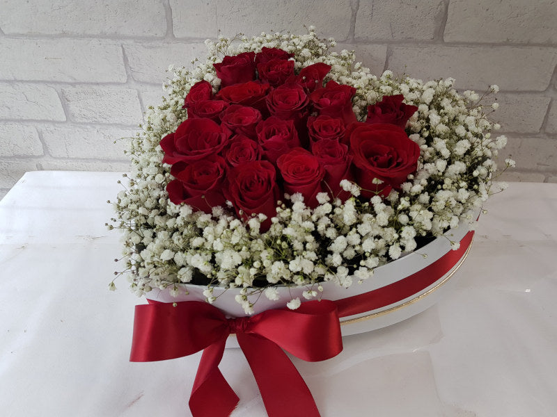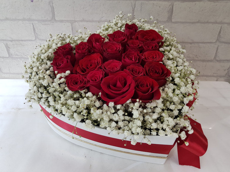 Your heart on display, represented by a heart-shaped composition made of passionate red Roses in the centre and a frame of heavenly Baby’s Breath.