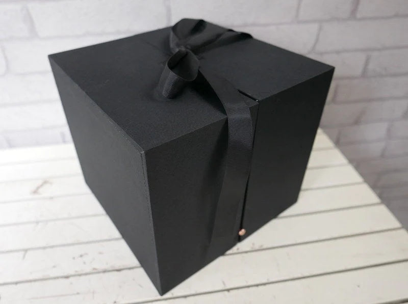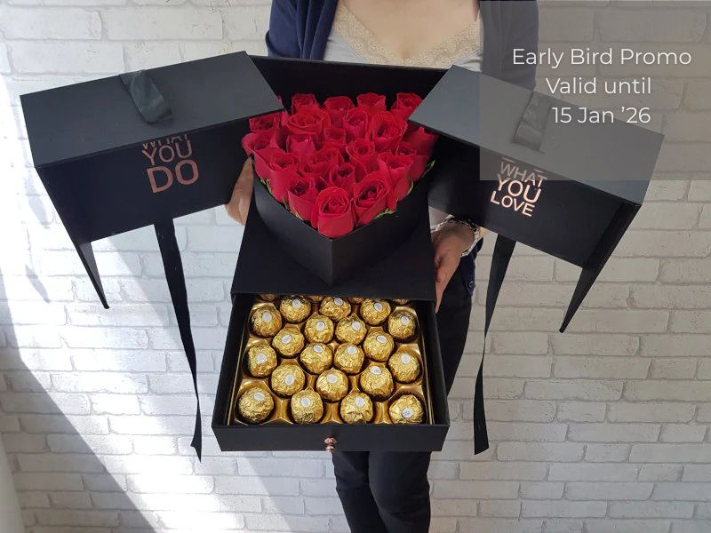 A mysterious box parts to reveal a heart-shaped bed of stunning red Roses and a hidden drawer of decadent chocolates.