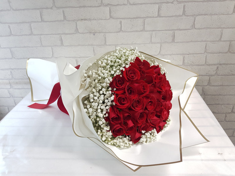 Classic Red Roses encircled in delicate Baby's Breaths to create a hand bouquet exuding passion and elegance. Translucent wrappings surround it with a heavenly air.