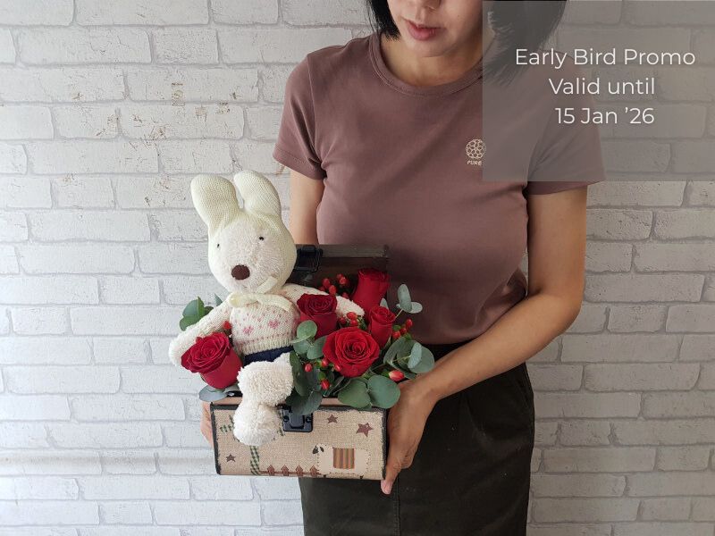 A cuddly bunny and romantic red roses, beautifully arranged in an open valise—sweet, charming, and full of love!
