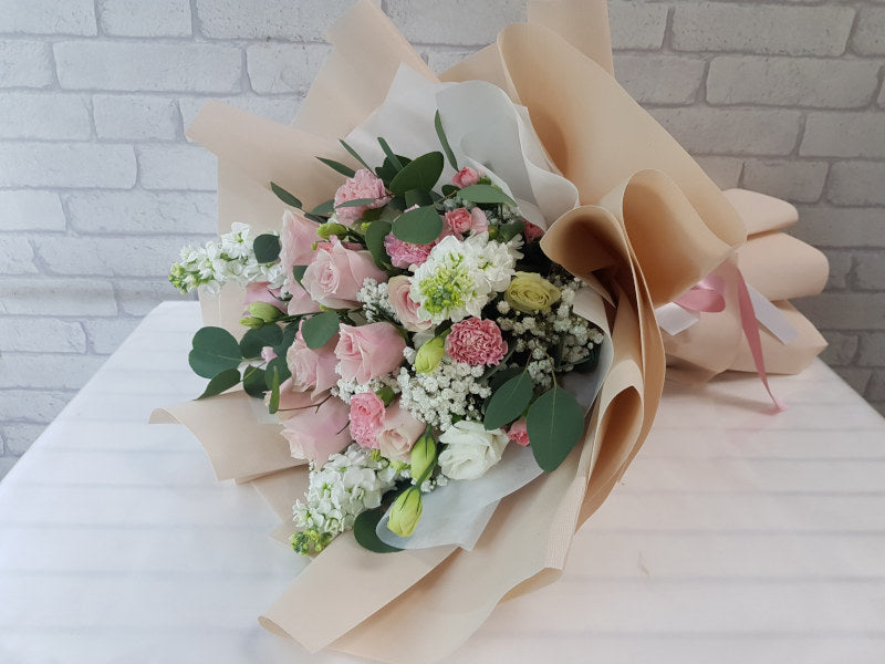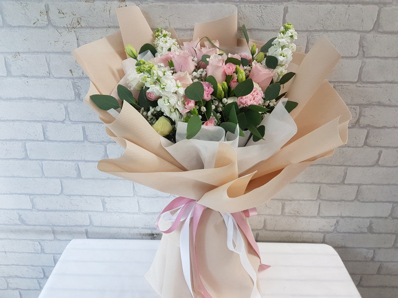 [As Shown] Mixture of 10 Roses, 3 Matthiolas, 5 Carnation, Carnation Spray, Eustomas, Baby Breath and Silver Dollar leaves