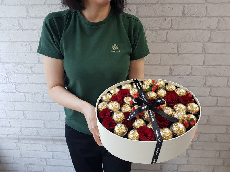 Chocolate and red roses elegantly arranged in a cream box, blending romance and indulgence in one irresistible gift
