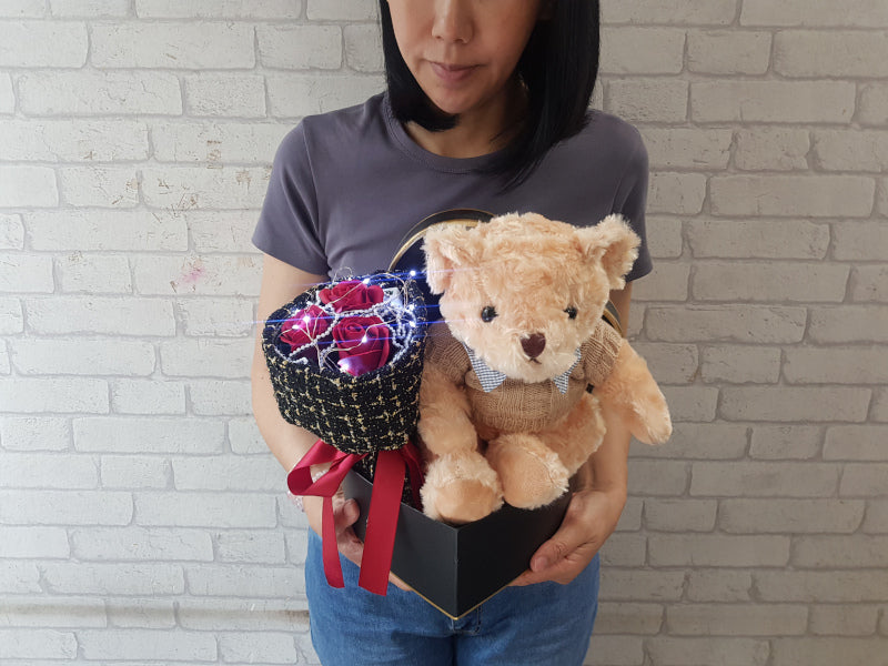 3 delicate, fragrant soap roses paired with a soft teddy bear, creating a lasting and adorable memory for Valentine’s Day.