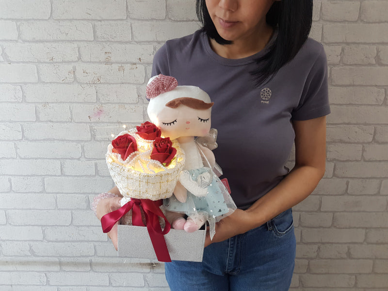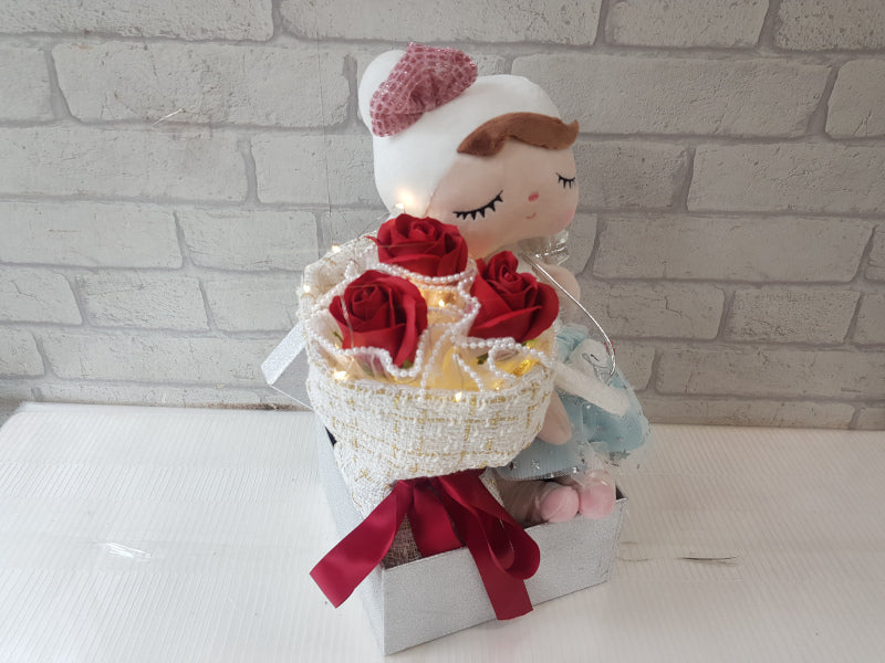 3 scented soap roses paired with a tucked-away shy girl plush. This "bashful" duo captures a sense of quiet affection and gentle romance, making it a sweet, whimsical alternative to traditional Valentine's gifts.
