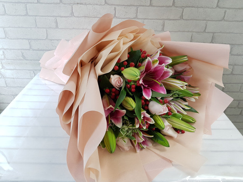 [Small] - Mixture of 3 lilies, 5 Roses, Euphorbia and Red Berries [Medium] - Mixture of 3 lilies, 10 Roses, Euphorbia and Red Berries [As Shown /Large] Mixture of 5 lilies, 10 Roses, Euphorbia and Red Berries