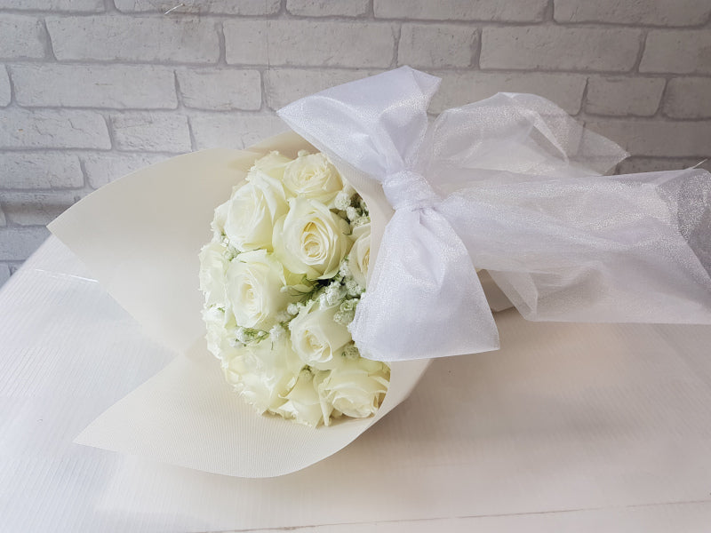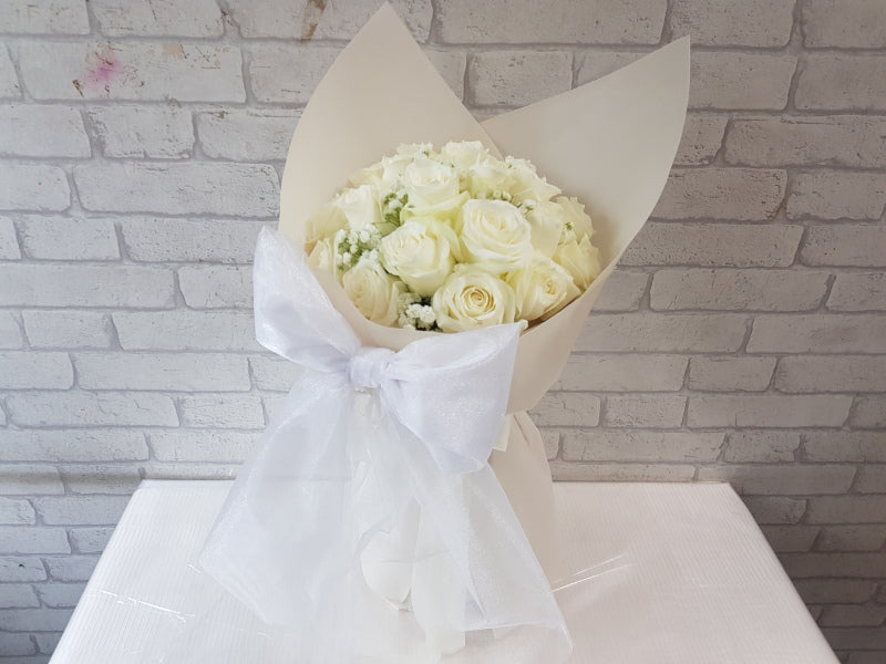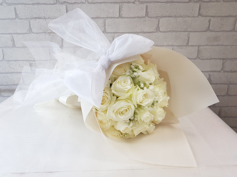 Hand bouquet of 20 white roses accented with baby’s breath, elegantly tied and finished with a large romantic bow, timeless and graceful. A moment that made her whole Valentine smile