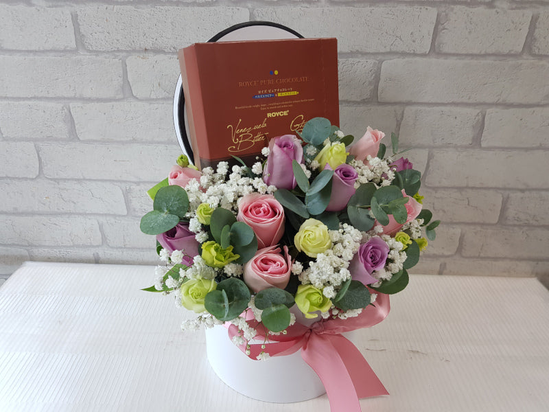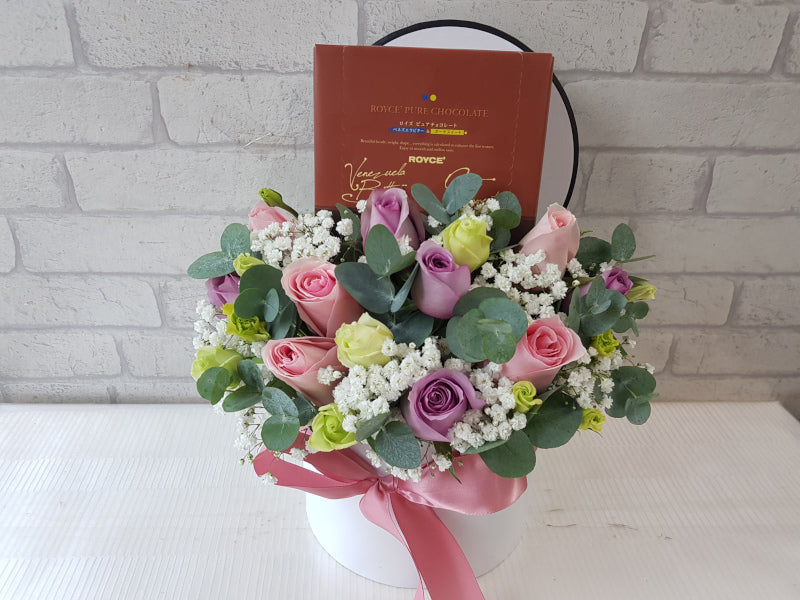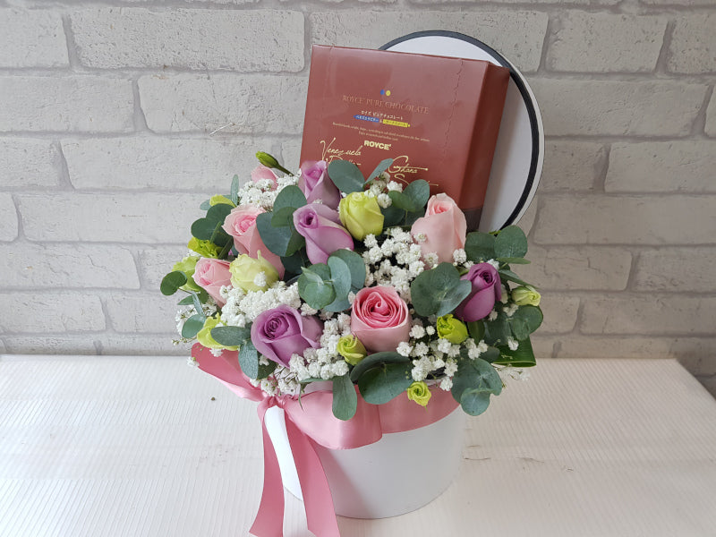 Lovely Roses decorated with ROYCE , nestled amongst soft Baby's Breaths and Eucalyptus Leaves, snug in a muted box to enhance without contradicting the pastel blossoms.