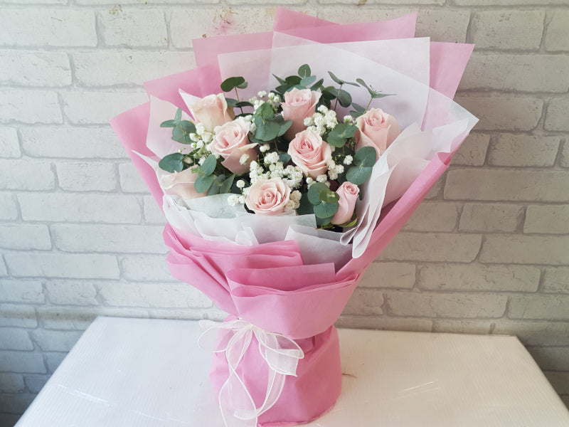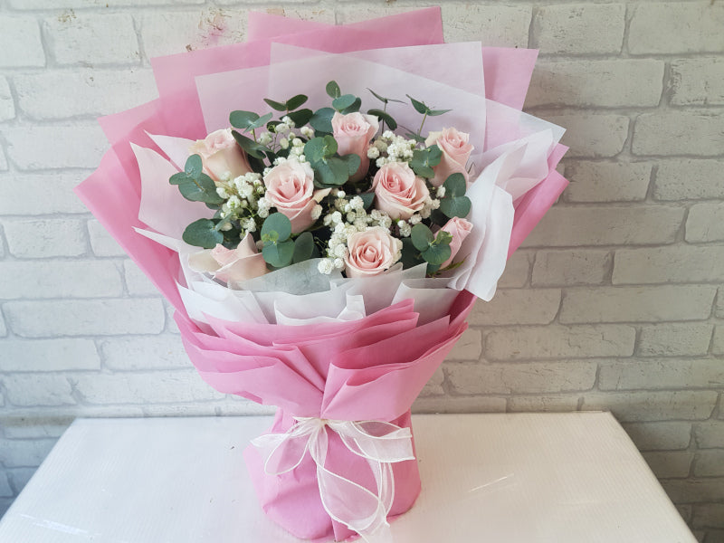Eight pink roses wrapped in clouds of baby’s breath, A gentle way to say you’re loved.