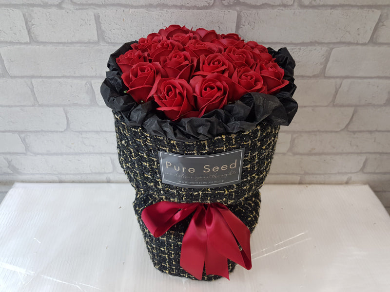 20 artificial soap roses wrapped in black. A statement of timeless love and modern elegance.