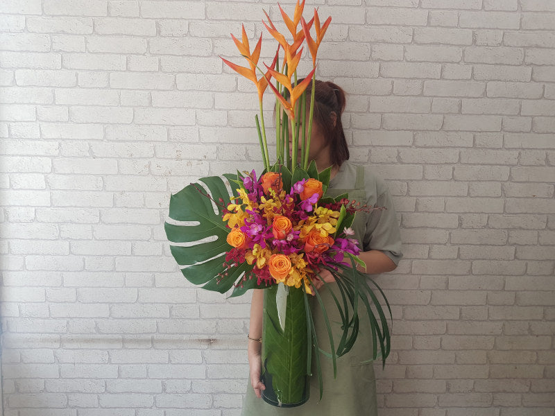 A stunning tall vase arrangement bursting with colorful roses, vibrant mokara orchids, and striking heliconias — a bold, tropical masterpiece that radiates joy, energy, and celebration in every bloom.